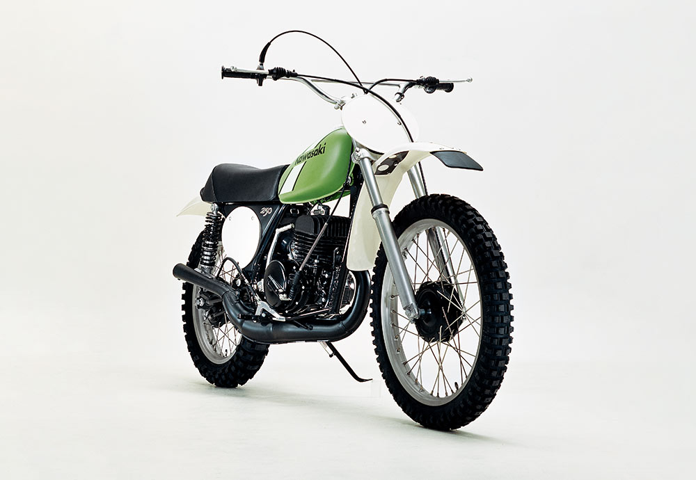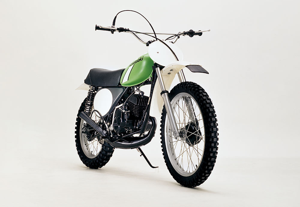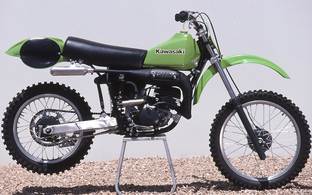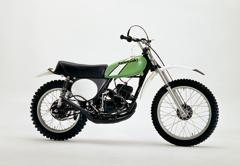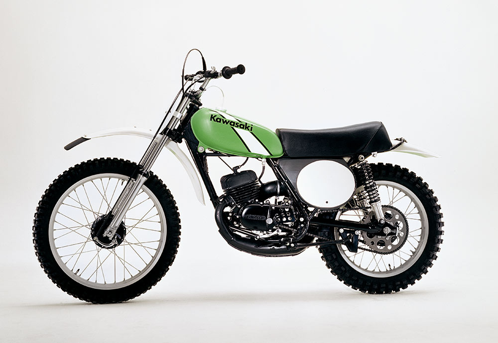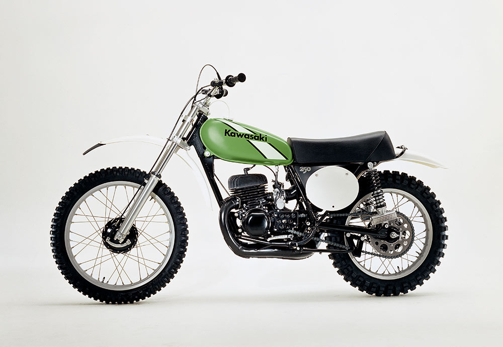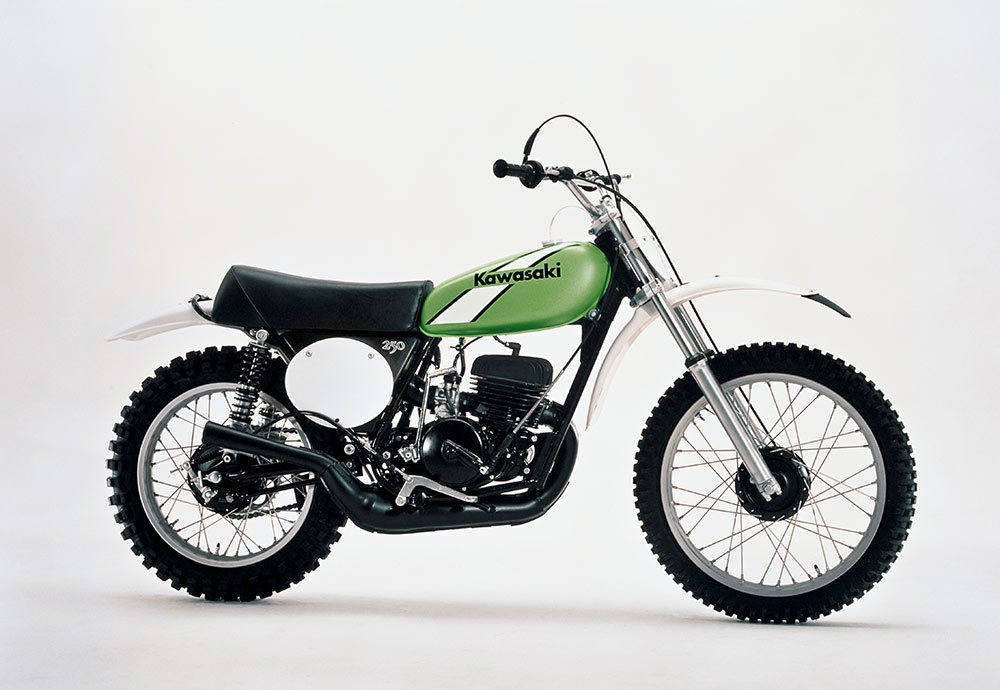 ライムグリーンを正式カラーとして初採用した、市販モトクロッサー。125はロータリーディスクバルブ、250にはピストンバルブを備え、ダウンチャンバーならではの膨張室容積と相まって、高出力とビッグトルクを発揮するエンジンが好評を博した。1973年に発売された当初は、250MX/125MXと呼ばれたが、型式名はファクトリーマシンと同じ、KX250/KX125だった。1975年からは呼称が改められ、KXシリーズとして定着していった。