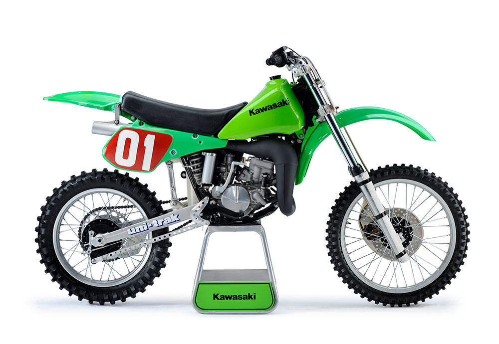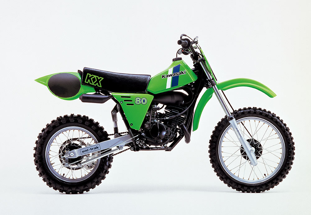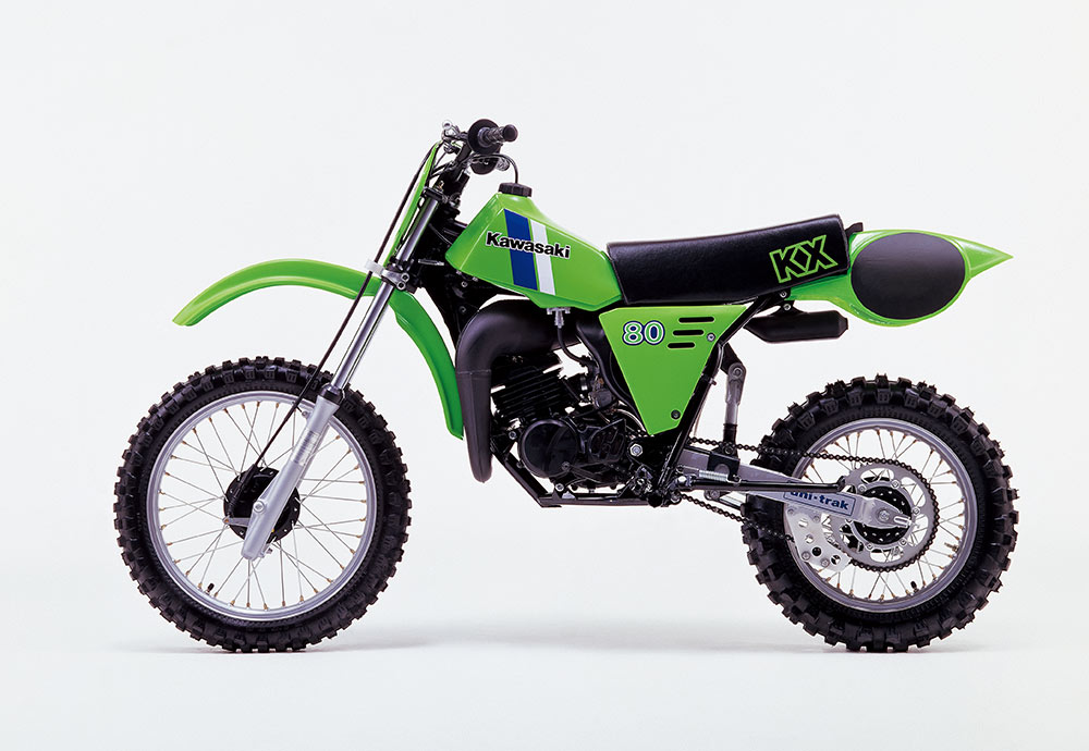 初代1979年モデルは2本ショックだったが、年に2度のマイナーチェンジを実施するなどの急進的な開発を経て、ユニトラックサスペンションが採用された1981年モデルのKX80。親子でモトクロスを楽しむ家族の羨望の的となったKX80は、折からのチームグリーン設立と相まってアメリカ中で大ヒットした。アマチュアの祭典だったポンカシティ(NMAグランドナショナル)では、やがてKXのエントリー数が大半を占めるまでになった。