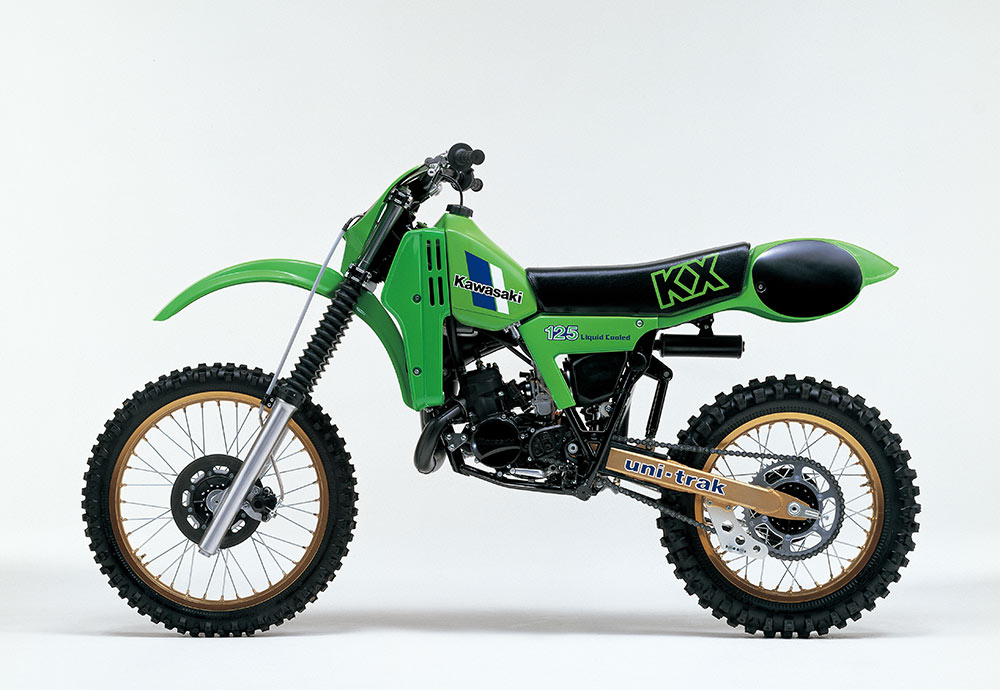 毎年フルモデルチェンジするのが当たり前だった激動期に、新技術満載で登場した1982年モデルのKX125。市販車に初採用されたフロントディスクブレーキ、水冷エンジン、進化したユニトラック、ゴールドアルマイト処理のアルミスイングアーム、ゼッケンを兼ねたリアフェンダーなど、歴代KXの中で最もカワサキらしい1台ともいえる。そして、前後300mmのホイールトラベルによる大柄な車格が、1980年代の標準になっていった。
