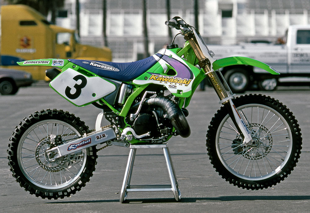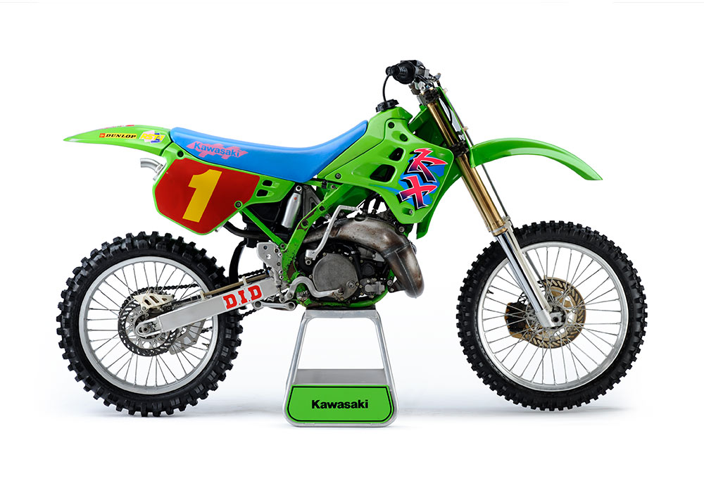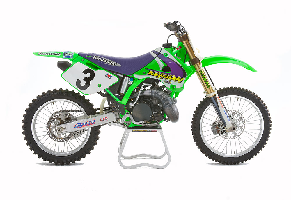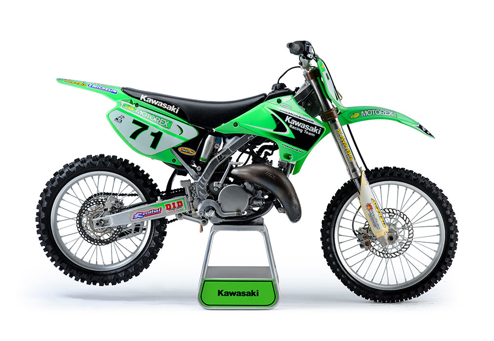 この1997年型のKX250は、ジェフ・エミッグのマシン。AMAのレギュレーションに則り市販車をベースに改造を施したものだが、随所にカワサキの最先端の技術が注ぎ込まれている。サブチャンバーを増設したフロントフォーク、吸排気系統をモディファイしたエンジン周りなどがファクトリー仕様の特徴。エミッグは1997年、AMAスーパークロスチャンピオン、AMAナショナルモトクロスでは前年からの2連覇となるダブルタイトルに輝いた。