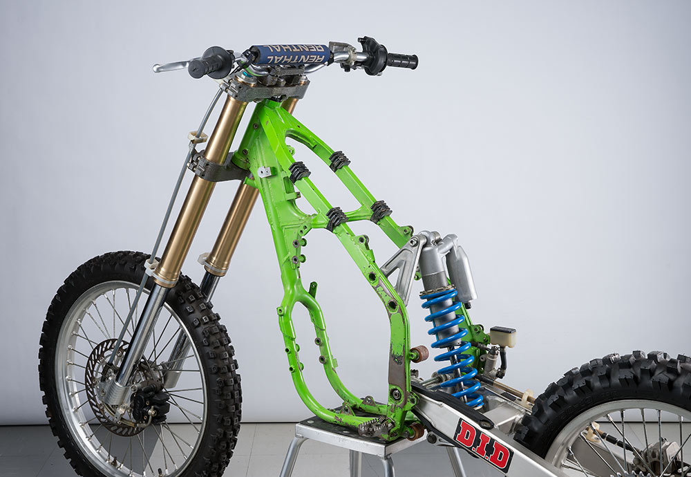 1989年全日本モトクロス後期250クラスでチャンピオンに輝いた、岡部篤史のKX250SR。既存のシングルバックボーン構造に代わり初採用した、2本の角パイプからなるペリメターフレームは、常に画期的なメカニズムの導入でモトクロス界をリードしてきたカワサキらしさの具現として、一大センセーションを巻き起こした。翌1990年モデルから市販KX250・KX125に採用されたペリメターは、現在のアルミフレームにつながる礎となっている。