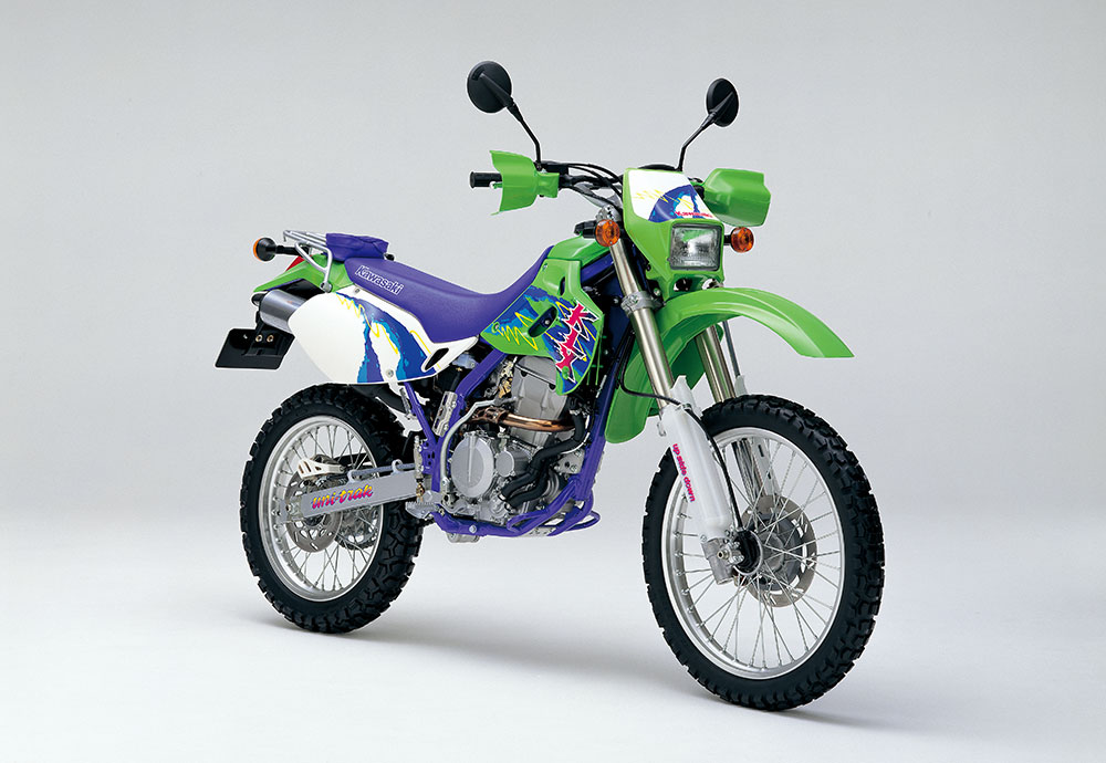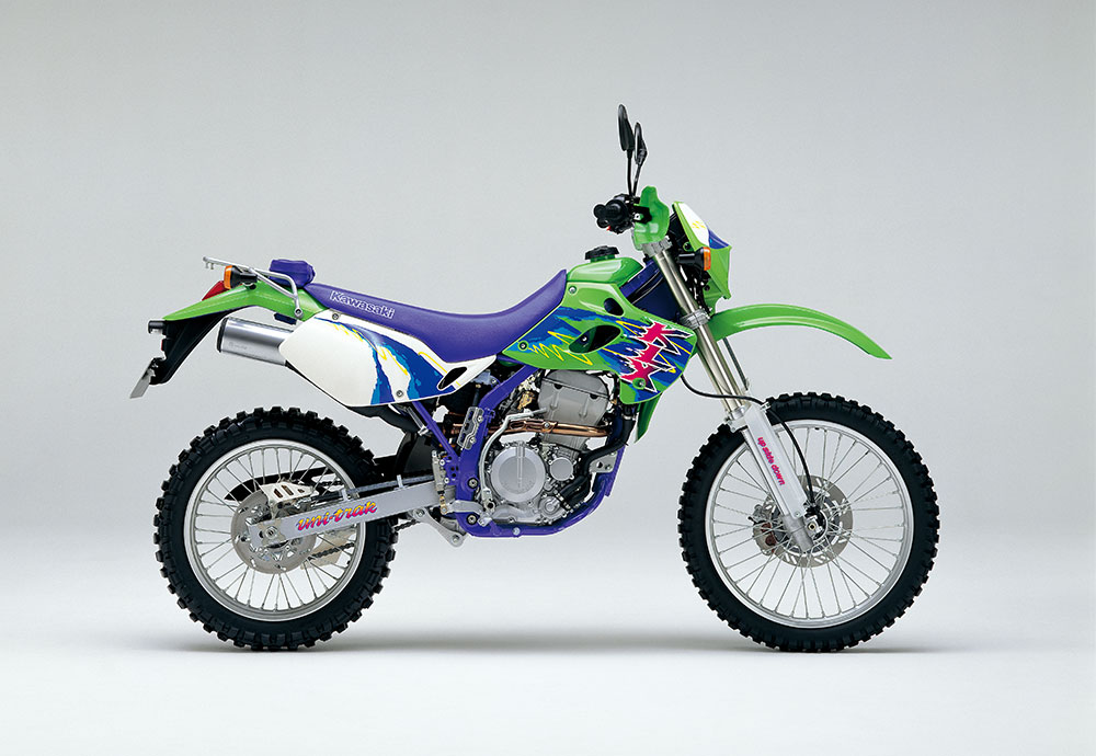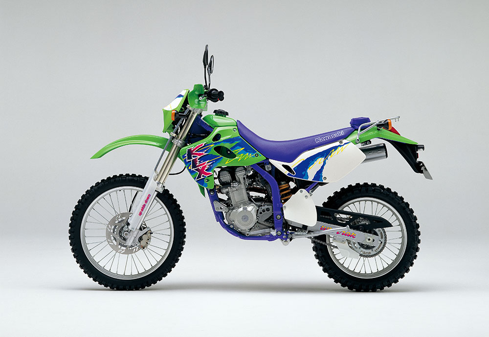 KDXシリーズの成功を受けて、4ストロークエンジンを搭載したKLX250R(競技仕様)とKLX250SR(公道仕様)がデビュー。カワサキのオフロードモデルラインナップに、2&4ストロークが完備された。KX譲りのペリメターフレーム、軽量でスリムな車体デザイン、水冷DOHC 4バルブエンジンなどのハイスペックを誇るKLXは、ハイパーオフロードレーサーとして大ヒット。1994年には、エレクトリックスターターを装備した、KLX250ESもバリエーションに追加された。