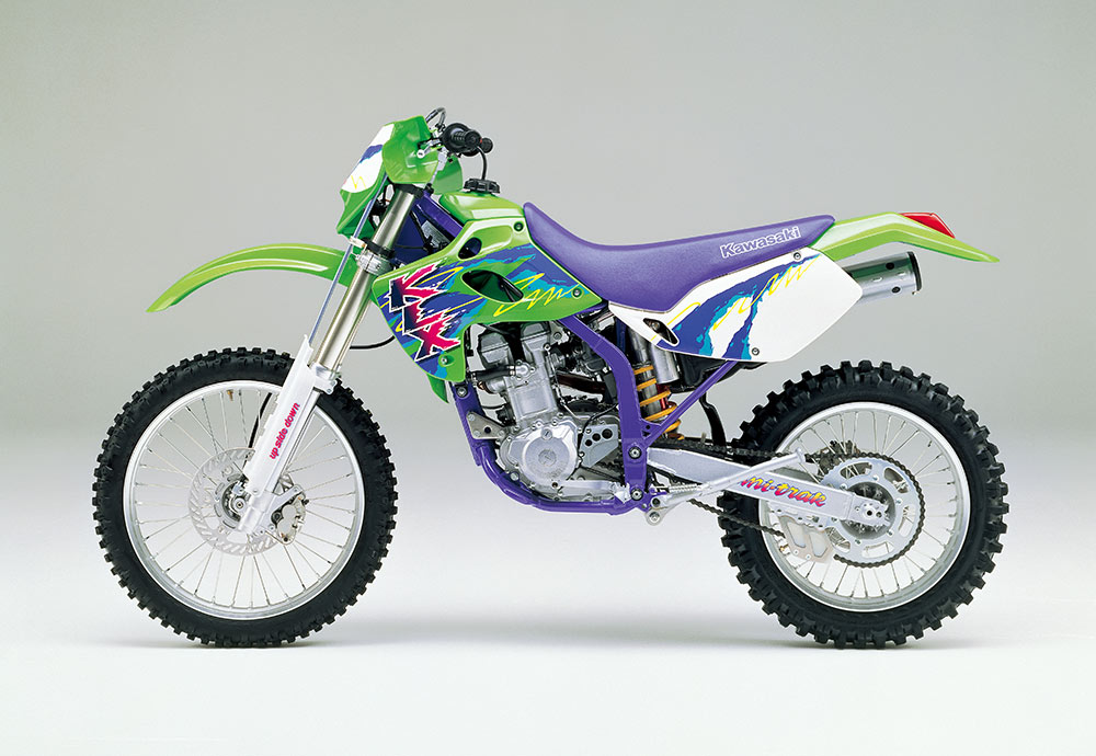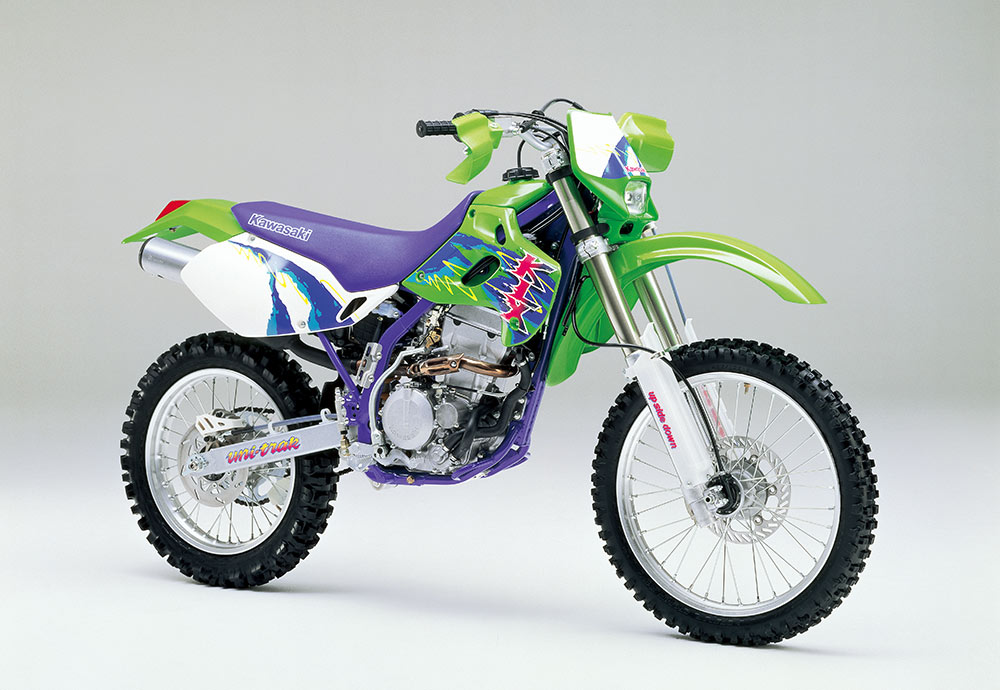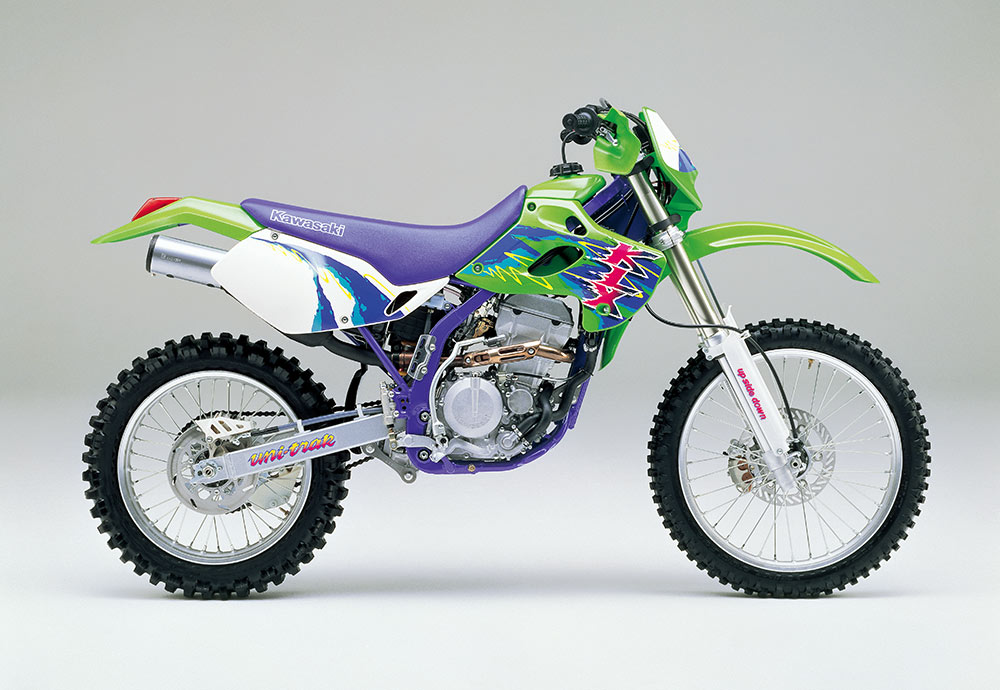 KX125のシャーシに、KL250(デュアルパーパス)の空冷OHC 2バルブエンジンを搭載した、エンデューロモデル。キャブレターや吸排気バルブの大径化に加え、新設計のエキゾーストなどによるマイルドで扱い易いパワー特性が好評を博した。競技志向の2ストローク車に対し、当時の4ストローク車はプレイバイク的な位置付けだった。Iビーム型アルミスイングアームを採用した足周りは、前後ホイールトラベル250mmを誇る本格装備だった。