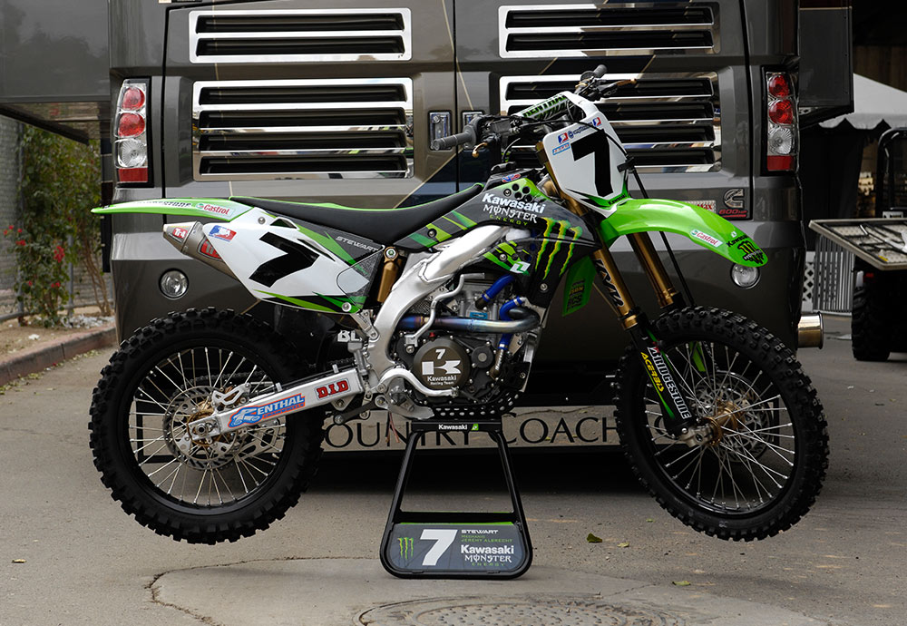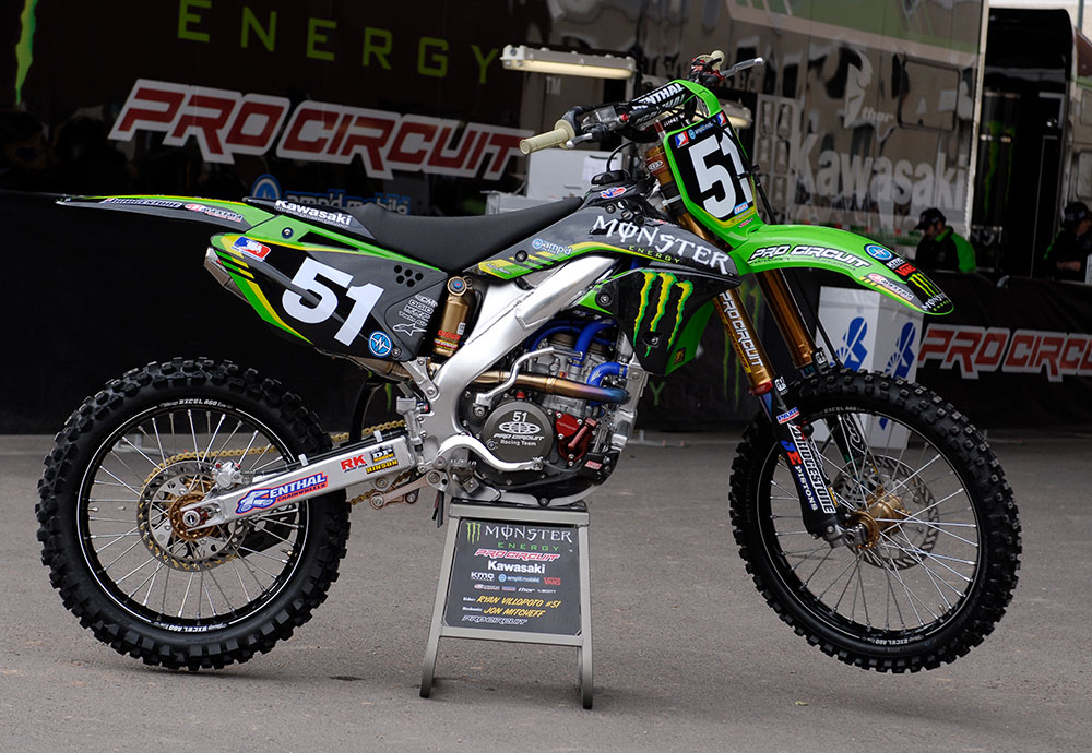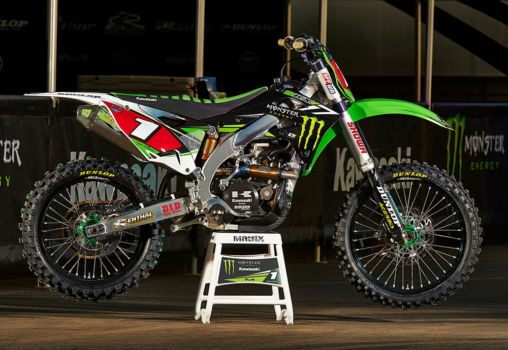 AMAスーパークロス4連覇(2011-14)を達成した、ライアン・ビロポートの2014年型KX450F。このシーズンより、マシン名にSR(スペシャルレーサー)が付記される。テクノロジーを駆使したセッティングを行うため、足周りにはストロークセンサーを装備。アノダイズされたトップブリッジには、GPSがマウントされている。ホールショット獲得に貢献するローンチコントロールモードは、ライダーの任意でオンオフを使い分けていた。