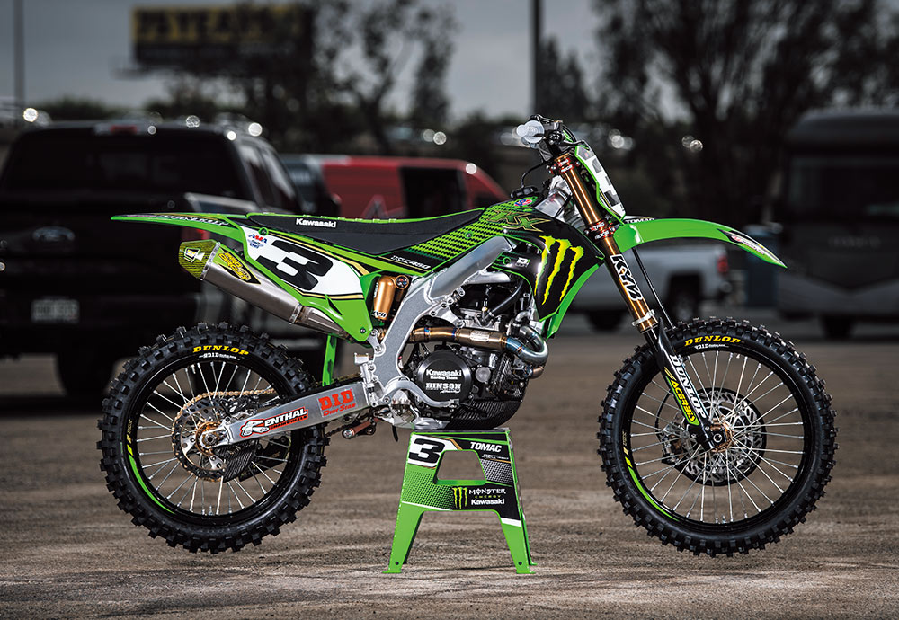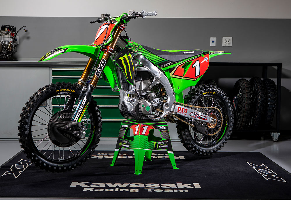 フルモデルチェンジされた2019年モデルのKX450をベースにした、イーライ・トマック車。AMAプロモトクロスでは、トマックがKX450F/KX450を駆り3連覇(2017-19)を飾った。キックに替わりエレクトリックスターターを採用したニューエンジンは、レゾネーターを追加したエキゾーストシステムでチューンナップ。足周りはKYBとSHOWAを併用しているが、フロントフォークには圧力センサー、リアにはリンケージの角度を検知するセンサーを装備し、データ解析が行われていた。