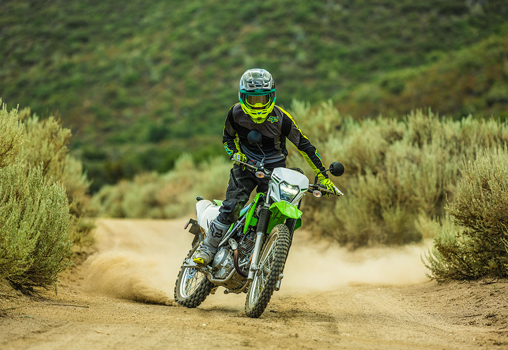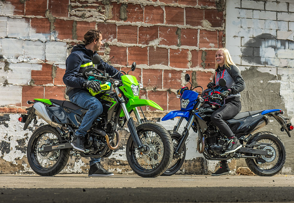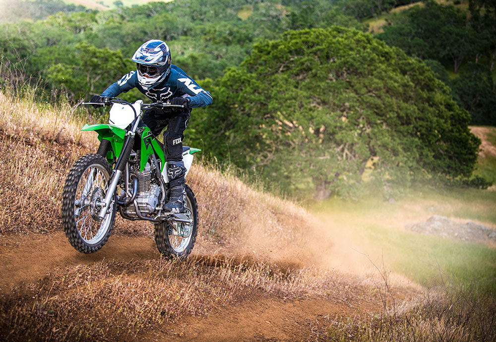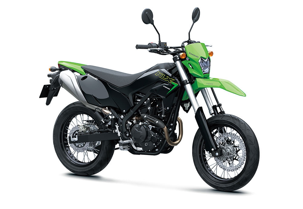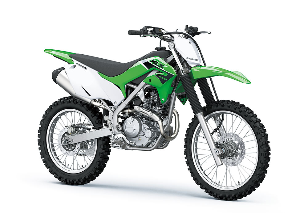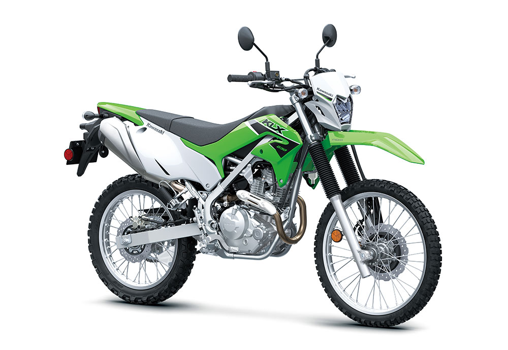 新軽量でトルクフルな空冷エンジン、高張力鋼ペリメターフレーム、KXをモチーフにした車体デザインなど、全てを一から新設計し、2020年モデルとしてデュアルパーパスモデルのKLX230、ピュアオフロードマシンのKLX230Rがデビュー。2023年モデルでは、KLX230のヘッドライトをLED化し、よりスリムなデザインに進化。そしてユーザーの幅広いニーズに応えるため、KLXシリーズのラインナップにスーパーモタードモデルのKLX230SMが加わった。