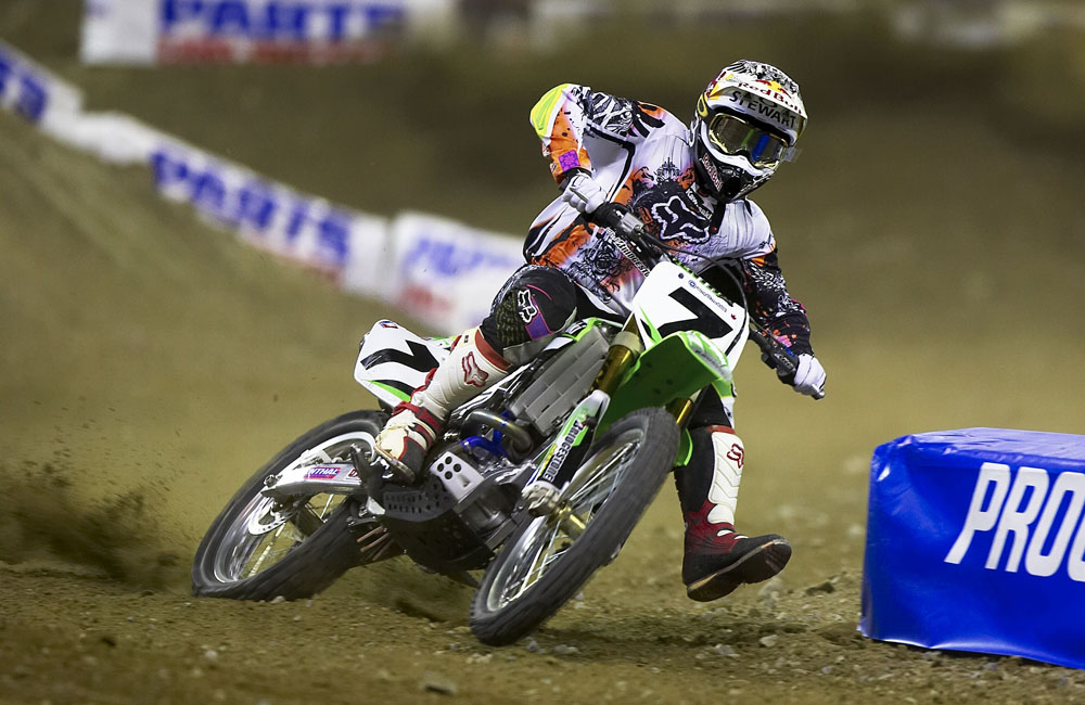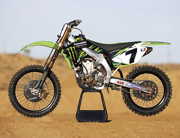 Thanks to the riding of James Stewart (KX450F), Ben Townley (KX250F/Lites East) and Ryan Villopoto (KX250F/Lites West), Kawasaki dominated AMA Supercross racing in 2007, capturing all three titles for the first time. The bike on which Stewart so convincingly won 13 of 16 rounds was the KX450F. The 450cc 4-stroke motocrosser had only debuted the year before, but it was already a champion in its second year. Key specifications came from the base machine, which featured a liquid-cooled DOHC engine with titanium parts, and an aluminium frame, with machine setup done by KMC (Kawasaki Motors Corp., U.S.A.).