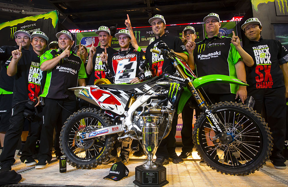 Ryan Villopoto won two consecutive AMA Supercross championships on the KX450F. This machine is based on the 2012 production model and tuned by KMC in the U.S. To reduce weight it features various titanium parts including the front wheel spokes. New features include a launch control mode for quick starts on surfaces with poor traction. During 2012, Villopoto was unable to ride in the final races of the season, but by winning nine of the fifteen races he still managed to defend his title.
